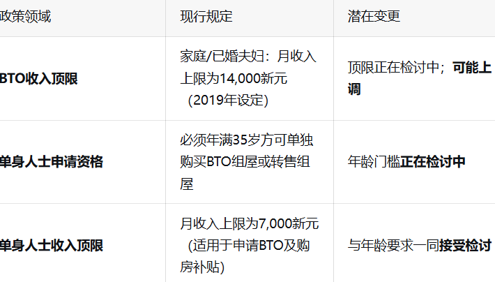 此次检讨旨在提高目前适用于夫妻申请BTO组屋的收入上限,该上限自2019年上次调整以来一直维持在14,000新元。对于单身人士,其资格门槛较低,月收入上限为7,000新元,并且必须年满35岁才有资格申请BTO组屋。